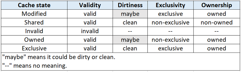 O(wned) :cache line是valid,owned、且可能是dirty的,但不是exclusive的。這條line只能被讀,并且擁有這條line的cache必須響應(yīng)其它c(diǎn)aches對這條line的請求。其它c(diǎn)ache也可能有這條line的只讀副本,但它們不是owners。這條line在memory中的副本可能已經(jīng)過期了。