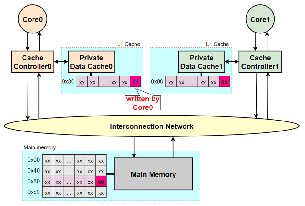 隨著摩爾定律的發(fā)展,人們試圖增加CPU的core數(shù)以提升系統(tǒng)整體性能,這類系統(tǒng)稱之為多core系統(tǒng)。一個包含多core的系統(tǒng)中,每個core可能都有自己的私有cache,并且有可能會對相同的memory地址進(jìn)行修改。如果多個core同時對同一memory地址進(jìn)行讀寫操作,很可能導(dǎo)致cache內(nèi)容不一致,從而導(dǎo)致數(shù)據(jù)不一致,最終造成系統(tǒng)出錯和崩潰。因此,在設(shè)計多core系統(tǒng)時,必須考慮cache一致性(cache coherency)問題來確保數(shù)據(jù)的正確性和系統(tǒng)的穩(wěn)定性。舉個例子,假設(shè)2個core的系統(tǒng),每個core私有的L1 cache的cacheline大小是64Bytes。兩個core都讀取0x80地址數(shù)據(jù),導(dǎo)致0x80開始的64Bytes數(shù)據(jù)都分別加載到core0和core1的私有L1 cache中。