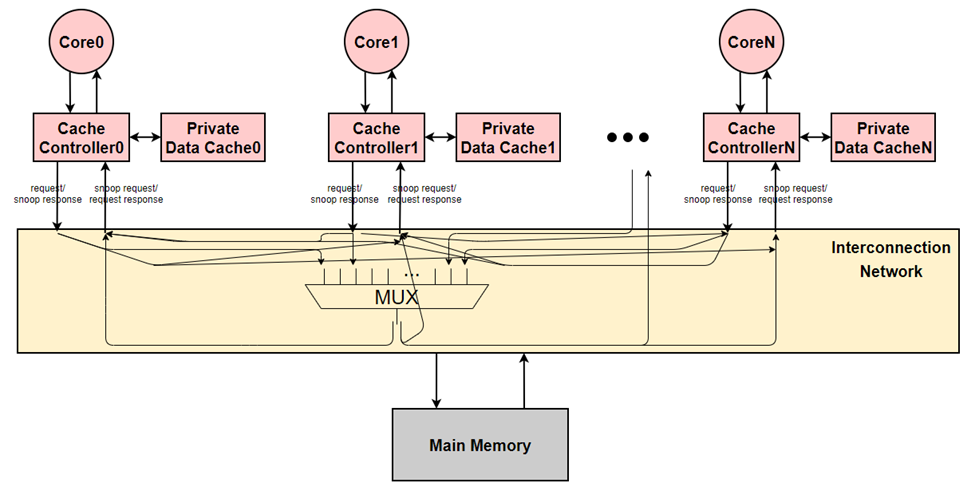 一致性協(xié)議的兩點(diǎn)原則在設(shè)計一致性協(xié)議時至關(guān)重要。舉個比較常用的一致性無效協(xié)議(invalidate protocols)的設(shè)計方法:1.如果一個core想要讀取memory地址A,它會向其它c(diǎn)ore發(fā)送消息,以獲取memory地址A當(dāng)前的最新值,并確保沒有其它c(diǎn)ore緩存該memory地址A的cacheline擁有寫權(quán)限的狀態(tài)。2.如果一個core想要寫入memory地址A,它會向其它c(diǎn)ore發(fā)送消息以獲取memory地址A的當(dāng)前值,并確保沒有其它c(diǎn)ore緩存該memory地址A的cacheline擁有只讀或讀寫權(quán)限的狀態(tài),也就是其它c(diǎn)ore都要無效掉自己緩存中memory地址A的cacheline。