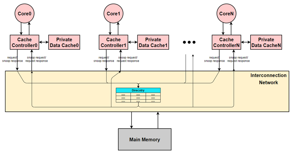 目錄協(xié)議最初是為了解決監(jiān)聽協(xié)議缺乏可擴(kuò)展性的問題而開發(fā)的。目錄協(xié)議會創(chuàng)建一個目錄來維護(hù)每一個cacheline的一致性狀態(tài)的全局視圖。該目錄跟蹤各cache保存了哪些cacheline以及處于什么狀態(tài)。Cache控制器發(fā)出的一致性請求將直接單播給目錄控制器(通常也稱作home)。目錄控制器要么直接響應(yīng)請求,要么根據(jù)目錄信息將請求轉(zhuǎn)發(fā)給一個或多個其它c(diǎn)ache控制器,然后由后者響應(yīng)。目錄協(xié)議使用間接層來避免有序廣播網(wǎng)絡(luò)和讓每個cache控制器處理每個請求。一致性請求傳輸流程通常包括兩個步驟(單播請求,然后是單播響應(yīng))或三個步驟(1個單播請求,K個轉(zhuǎn)發(fā)請求和K個響應(yīng),其中K是共享者的數(shù)量)。有些協(xié)議甚至還有第四部,因為響應(yīng)間接通過目錄控制器,或者因為請求者在一致性流程完成時通知目錄控制器。相比之下,監(jiān)聽協(xié)議將一個cacheline的狀態(tài)分布在所有cache控制器上,由于這種分布式狀態(tài)沒有中央單元記錄信息,一致性請求必須被廣播到所有cache控制器上。因此監(jiān)聽協(xié)議的一致性請求流程總需要兩個步驟(廣播請求,然后是單播響應(yīng))。