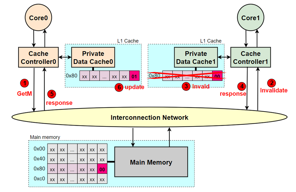 Core0修改0x80地址數(shù)據(jù)的時候,除了更新core0的私有cache之外,還應(yīng)通知core1的私有cache將0x80地址所在的cacheline置為無效。保證core1讀取數(shù)據(jù)時不會命中自己的cache。這樣core1就必須重新從core0或memory中去讀取0x80地址最新的數(shù)據(jù)。