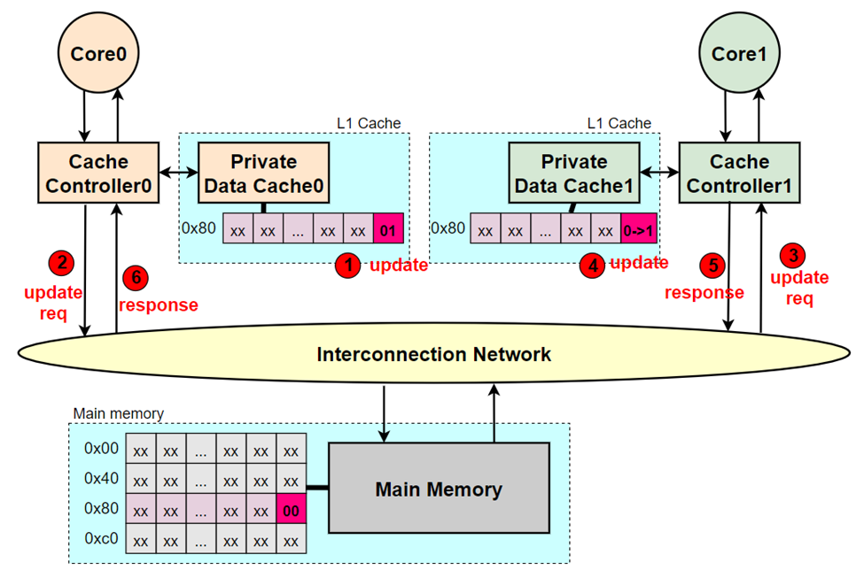 Core0修改0x80地址數(shù)據(jù)的時候,除了更新core0的私有cache之外,還應(yīng)將修改的數(shù)據(jù)通知到core1的私有cache去更新0x80地址的數(shù)據(jù)。