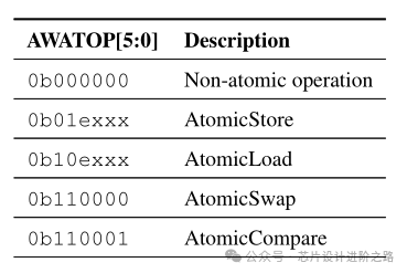 AXI5引入了更多類型的原子操作,增加了AWATOP[5:0]信號(hào),但是AXI5 協(xié)議在現(xiàn)實(shí)中用的比較少,還是AXI4比較常見,可以只做了解,具體使用的時(shí)候去查協(xié)議對(duì)照就行,不用花太多時(shí)間。