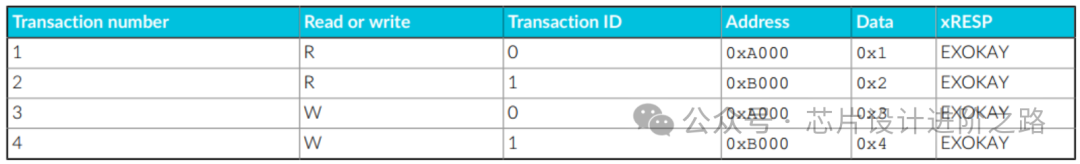 從屬接口包括可以為每個(gè)事務(wù)保存訪問的ID和地址的獨(dú)占訪問監(jiān)控硬件。下表描述了示例序列中的不同事務(wù)。表中的所有事務(wù)都是獨(dú)占訪問: