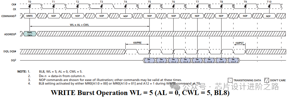 寫操作可以配置不同的突發(fā)長度(如BL4, BL8)和突發(fā)類型(如Sequential, Interleave)。