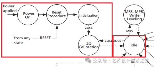 DDR3 SDRAM從上電到進入空閑狀態(tài)的過程中,經(jīng)歷了一系列初始化步驟,包括上電、復(fù)位、初始化、ZQ校準(zhǔn)和空閑狀態(tài)。