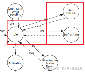 進入自刷新模式需要通過特定的命令序列,包括預(yù)充電所有Bank、設(shè)置自刷新命令(SRE)等。