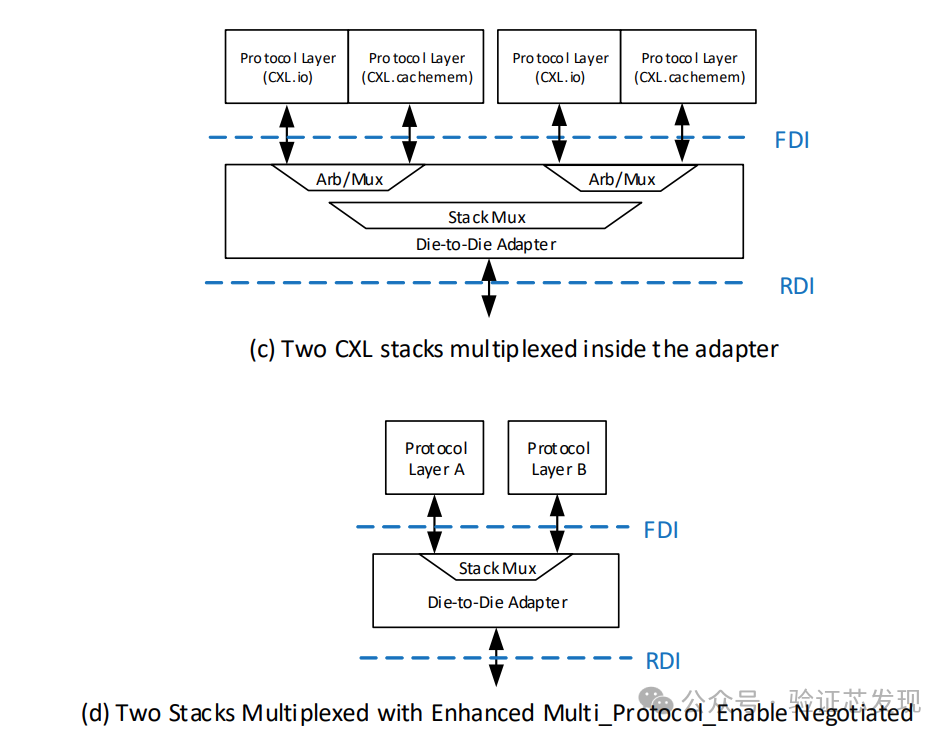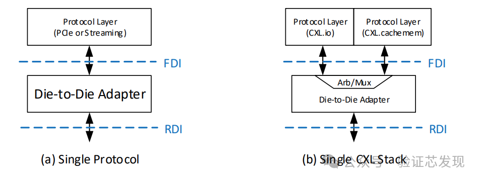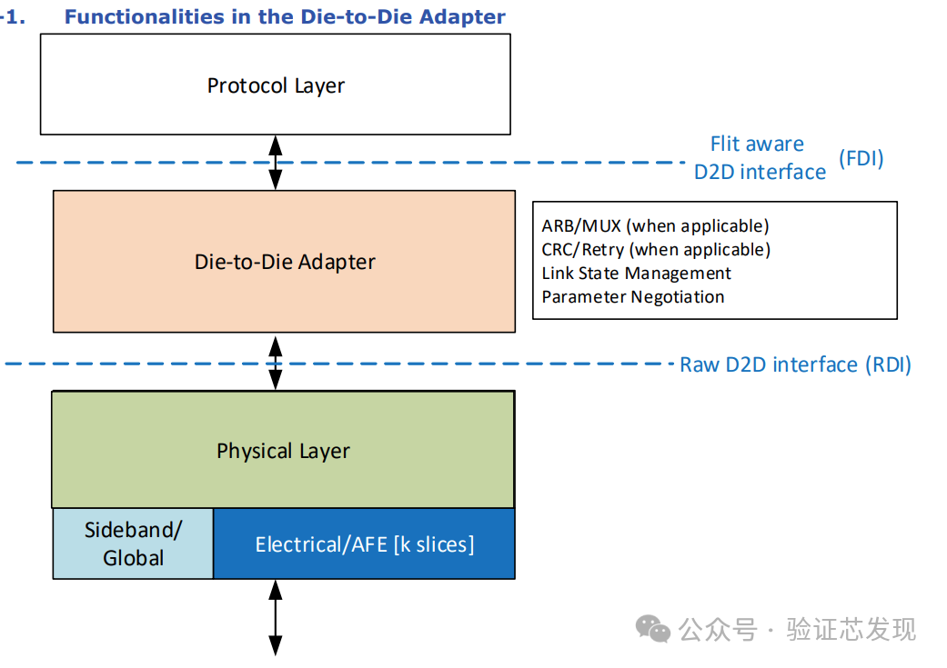 protocol和Adapter之間基于flit的FDI接口,即flit aware D2D interface。Adapter和PHY之間基于RDI接口,Raw D2D interface。功能示意如下: