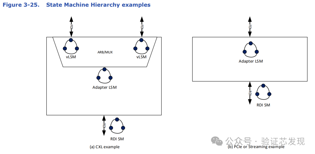 對(duì)于CXL,ARB/MUX的vLSM(虛擬低層狀態(tài)機(jī))體現(xiàn)在FDI的pl_state_sts。Adapter LSM用于協(xié)調(diào)與remote link partner的鏈路狀態(tài),適用于所有配置。每個(gè)協(xié)議棧都有其對(duì)應(yīng)的適配器狀態(tài)機(jī)。對(duì)于PCIe或Stream protocol傳輸,Adapter LSM體現(xiàn)在FDI的pl_state_sts。