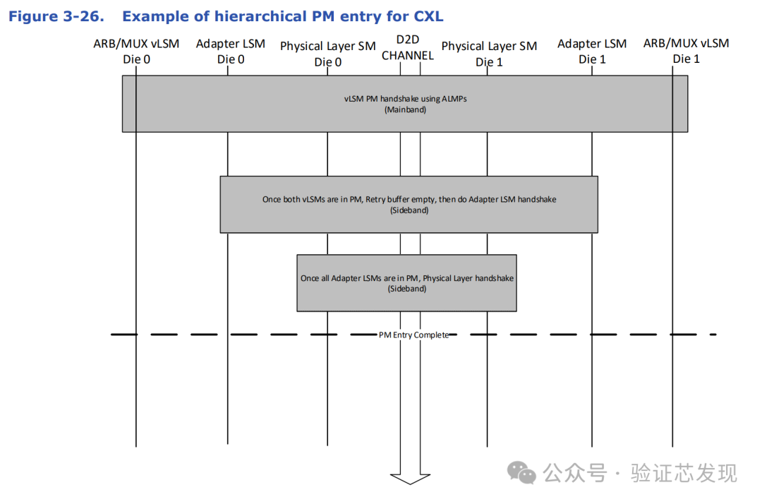電源管理狀態(tài)轉(zhuǎn)換:對(duì)于CXL協(xié)議,CXL.io和CXL.cachemem vLSMs必須在相應(yīng)的Adapter LSM過渡到電源管理(PM)狀態(tài)之前先過渡到PM狀態(tài)。如果同一個(gè)Adapter上啟用了多個(gè)棧,則所有Adapter LSMs在RDI SM過渡到PM狀態(tài)之前必須處于PM狀態(tài)。PM狀態(tài)則是自上而下逐層轉(zhuǎn)換。