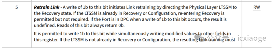 3.將PCI Express Capability Structure中的Link Control Register的Retrain Link字段寫1,pcie鏈路將進(jìn)行retrain操作。