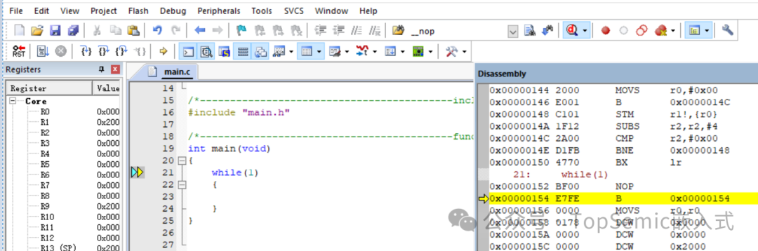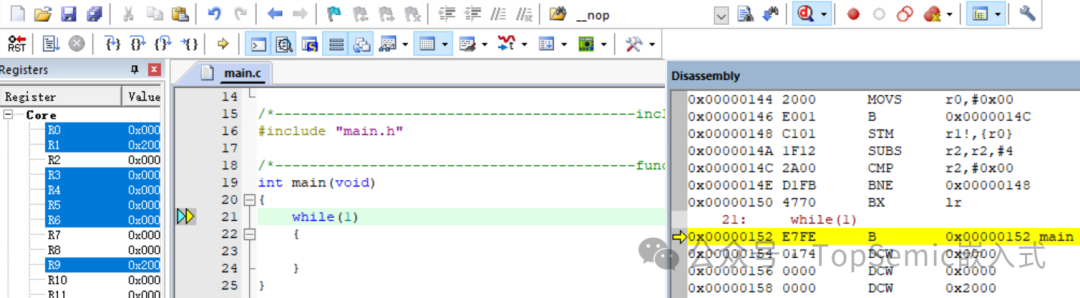 C代碼的while(1)被匯編成了2條指令,即NOP和B,跳轉(zhuǎn)指令B前自動(dòng)插了一個(gè)NOP。while(1)實(shí)際上是先執(zhí)行一個(gè)NOP指令,再執(zhí)行B指令,B指令跳轉(zhuǎn)的地址就是自身的地址,達(dá)到無限循環(huán)的效果??梢钥吹酱藭r(shí)while(1)里NOP指令地址是0x00000152(十進(jìn)制338),B指令地址是0x00000154(十進(jìn)制340)。