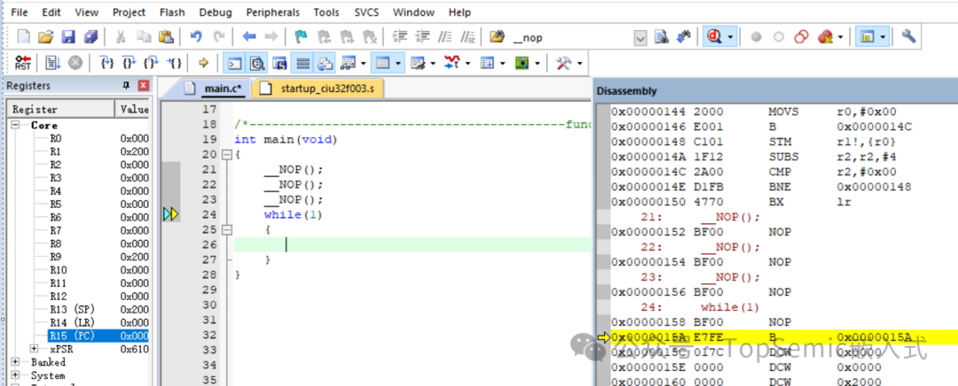 當(dāng)while(1)前插入奇數(shù)條NOP指令后,while(1)對應(yīng)的指令地址會改變。