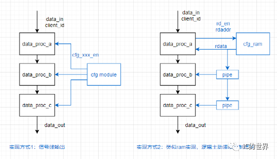 通過(guò)寄存器信號(hào)線的方式輸出給需要的模塊,如圖方式1,cfg module把所有的控制信號(hào)都暴露出來(lái),送給需要的模塊data_proc_a/b/c,data有效時(shí),根據(jù)client_id選擇需要的控制信號(hào)。