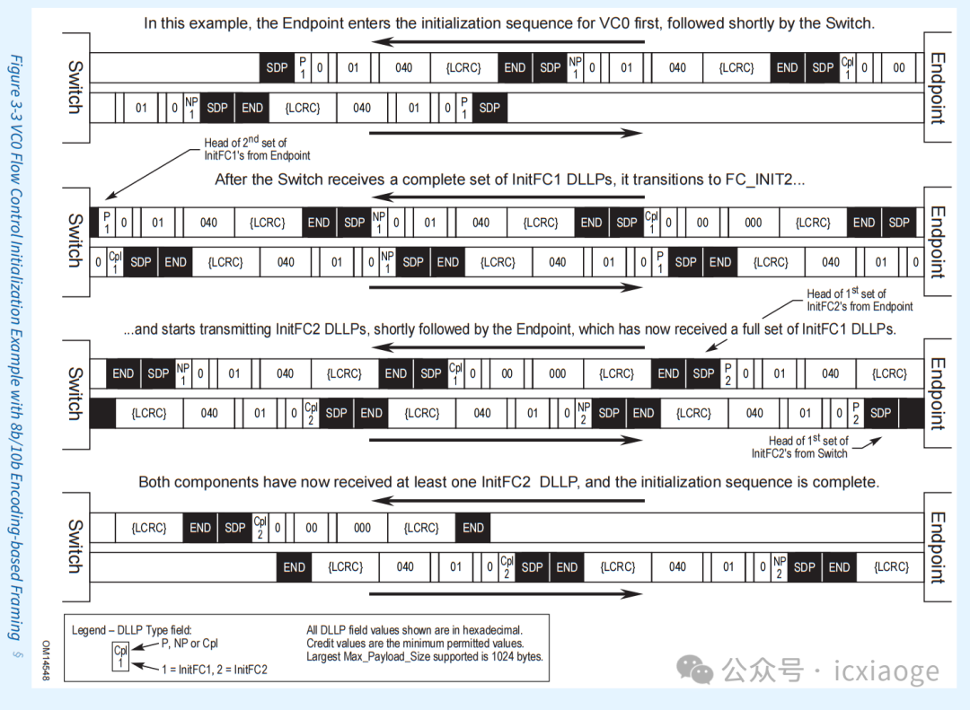 為了保證InitFC1 DLLP能夠得到足夠的傳輸頻率,此時(shí)數(shù)據(jù)鏈路層會(huì)阻塞其他類型的傳輸,例如阻塞Ordered Sets), Ack and Nak DLLPs (when applicable), 以及其他VC的TLP