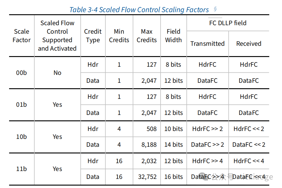 Scaled Flow Control機(jī)制目的就是現(xiàn)有FC DLLP字段位寬分布不修改的情況下,增加credit數(shù)量上限的方法,即用比例縮放的方式描述credit。當(dāng)Scale Factor為10b時(shí),此時(shí)表示放大4倍,這樣情況下,有限的FC DLLP filed字段能夠表示的credit上限就增加了。