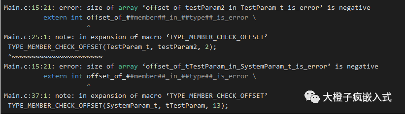 編譯時(shí)則報(bào)錯(cuò):(通過offset_of_testParam2_in_TestParam_t_is_error就能定位是哪個(gè)結(jié)構(gòu)體的哪個(gè)成員變量偏移位置不對(duì)了):