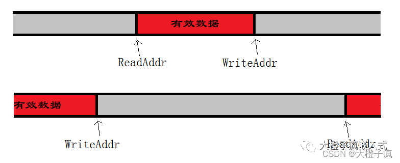 “寫索引”在前面,“讀索引”在后面,即在索引移動方向上,“寫索引”超前于“讀索引”,已寫入但未被讀取器處理的有效數(shù)據(jù)位于“讀索引”和“寫索引”之間的緩沖區(qū)內(nèi);