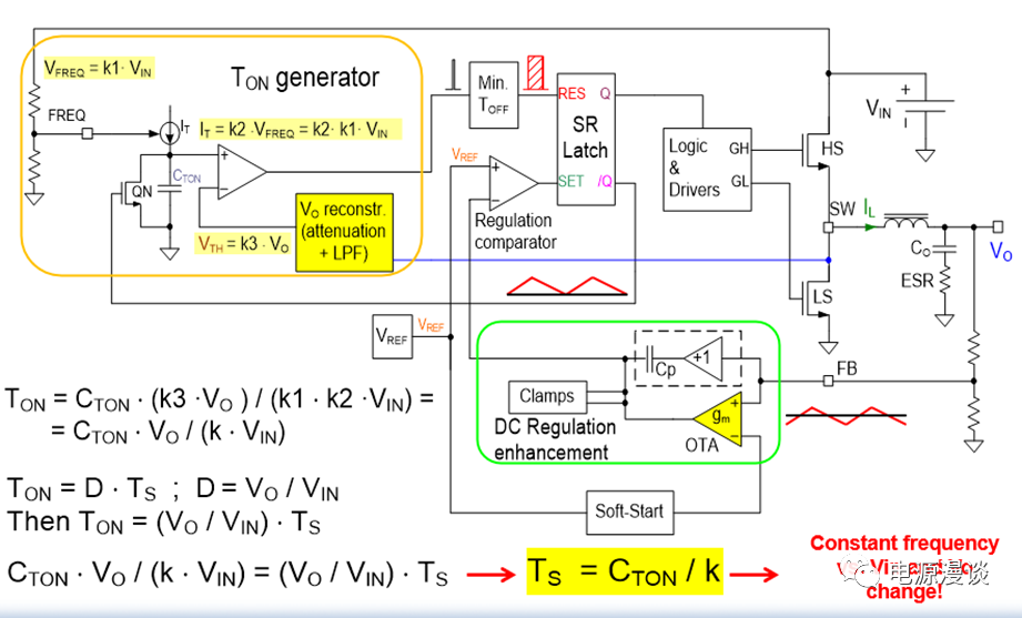 在COT電路的基礎上又進化出來自適應COT架構,這種非線性控制方式的控制核心還是高速比較器,和COT控制的差異是它可以動態(tài)地根據(jù)輸入電壓和輸出電壓去調整導通時間,以維持開關周期的恒定,所以避免了一些應用上COT變頻導致的問題。但是在瞬態(tài)工作時,其變頻的快速響應的優(yōu)勢還是存在的,所以應對負載快速瞬態(tài)時,電壓過沖或者跌落是很小的。