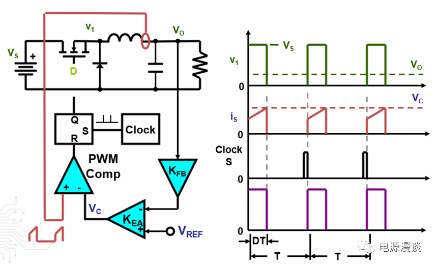 簡單介紹一下電壓模式控制的原理,電壓模式控制是一個定頻的控制模式,通過一個固定頻率的時鐘產生固定的開關頻率,同時有一個斜坡電壓和開關頻率同頻率用于產生控制信號的比較標準,在斜坡開始時輸出開關脈沖信號。