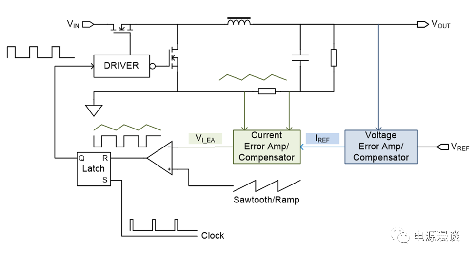 電流模式控制,除了具有一系列優(yōu)點之外,它還有一些不足之處,如全范圍的穩(wěn)定性,及抗噪聲干擾性能等,我們接下來會再進一步討論。電流模式控制有多種形式的變形,如峰值電流模式控制,谷值電流模式控制,平均電流模式控制等。我們先討論一下電流模式控制的一種典型形式,即峰值電流模式的結構,如圖2所示。