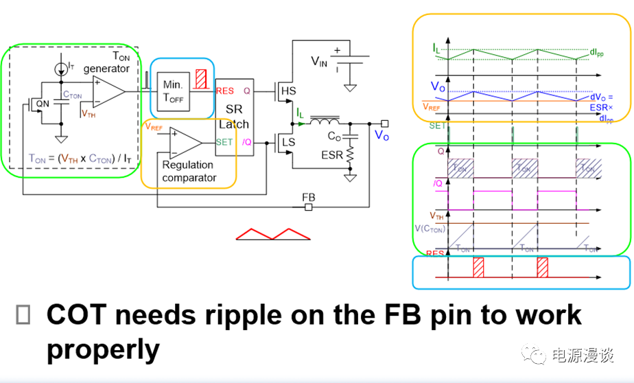 但是它的缺點也很明顯,主要是由于開關頻率隨著負載和輸入電壓變化是變頻的,所以它無法用外部時鐘去同步,由于它的控制核心是比較器滯環(huán)比較,所以必須使得輸出電壓存在一定的紋波,由于控制電路中不包含電流保護,所以這部分電路需要另外設計。雖然這種控制方式有這些缺點,但是還是被改良出來一些變化的控制方式,以避免這些缺點,COT控制及自適應COT控制就是其中典型的類型。