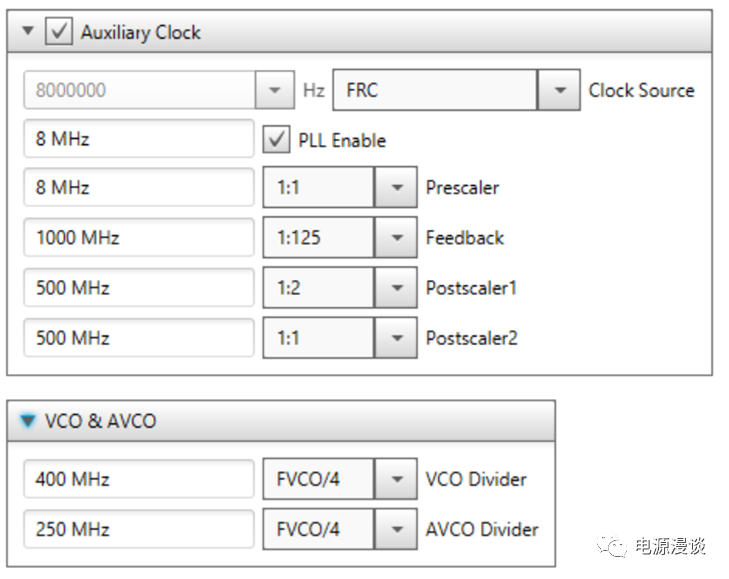 輔助時(shí)鐘同樣采用內(nèi)部FRC振蕩器,通過(guò)APLL的適當(dāng)配置達(dá)到500M的時(shí)鐘輸出,作為PWM模塊的輸入時(shí)鐘。此時(shí)我們注意FVCO/4為400M, 會(huì)用它作為ADC的輸入時(shí)鐘,將ADC內(nèi)核時(shí)鐘配置為66.5MHz,以滿(mǎn)足小于70MHz的要求。