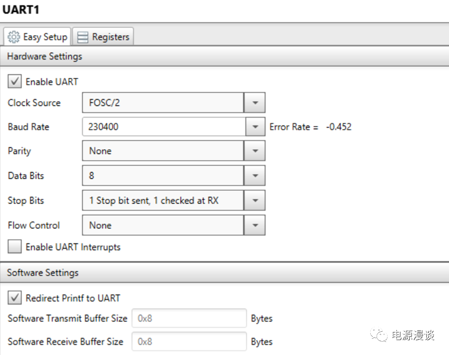 通過(guò)參考硬件Demo板的UART端口連接,在MCC中設(shè)置相應(yīng)的端口,并使能UART的起始狀態(tài)為高。此處AN0為我們監(jiān)控的采樣數(shù)據(jù)通道,對(duì)應(yīng)板上的P2可調(diào)電阻電壓輸入。