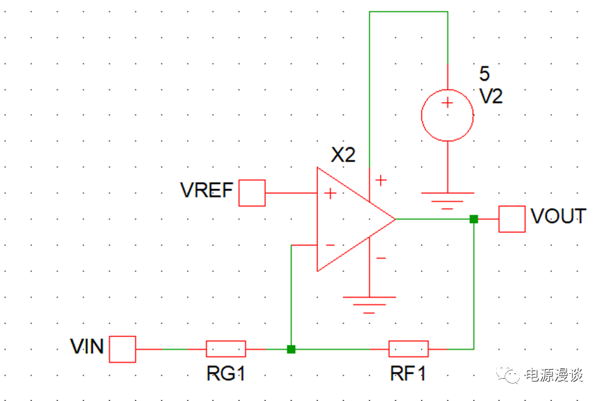 反向放大運放輸入信號通過RG1電阻接到反相放大輸入端,同時輸出信號也通過反饋電阻RF1接到反相輸入端,同相端我們放置一個參考電壓VREF。