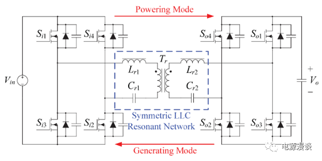 當功率開關(guān)運行時,它是逆變級,將交變電壓施加到變壓器,整流級的開關(guān)關(guān)閉,通過整流級的功率開關(guān)的反并聯(lián)體二極管整流傳遞能量。逆變級在原邊時,變換器為供電模式,相對應的,逆變級在副邊時,變換器為發(fā)電模式。