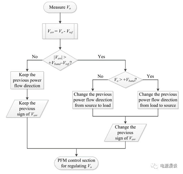 類似的,功率轉(zhuǎn)換方向可以從發(fā)電模式改為供電模式,當負載電流變?yōu)檎龝r,輸出電容電壓由于負載和功率轉(zhuǎn)換的雙重放電會降低到-Vband,則變換器由發(fā)電模式改為供電模式,輸出電壓又會提升為Vref,同樣可以由一個PFM控制器來控制。
