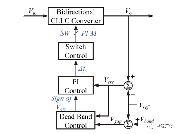 如圖4所示,基于Vgap這個量,Dead-band控制器可以選擇功率轉(zhuǎn)換的方向,它是輸出電壓和Vband的電壓差。通過Dead Band控制器,可以判斷電壓誤差的符號Sign of Verr,PI控制器使用電壓誤差及其符號來調(diào)整輸出電壓。