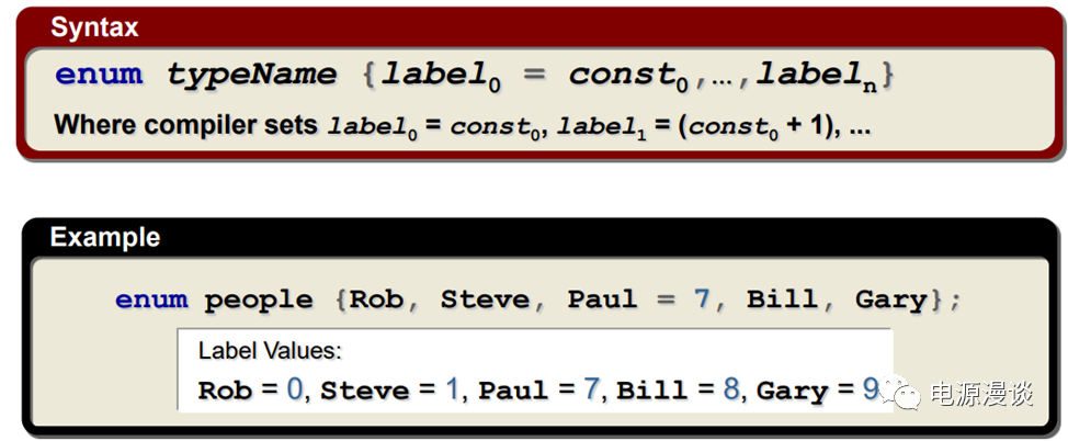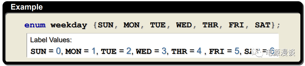 如上圖2的示例中,我們定義了一個(gè)weekday這樣一個(gè)枚舉變量,其中包含七個(gè)常數(shù)標(biāo)簽,SUN,MON,TUE,WED,THR,FRI,SAT這七個(gè)常數(shù)標(biāo)簽。默認(rèn)情況下,它們的值為從0到6的整數(shù)。