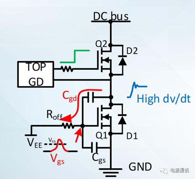 在硬開(kāi)關(guān)拓?fù)渲?,開(kāi)關(guān)頻率如果很高的話,由于漏極節(jié)點(diǎn)很高的dv/dt很容易產(chǎn)生漏極Vds高頻噪聲,以半橋開(kāi)關(guān)為例,如圖1所示,當(dāng)上管開(kāi)通時(shí),下管處于關(guān)斷瞬間,漏極電壓VDS通過(guò)寄生米勒電容Cgd很容易傳導(dǎo)到門級(jí)一個(gè)電壓,這個(gè)電壓可能會(huì)導(dǎo)致下管超過(guò)VGS,th而誤開(kāi)通,如果關(guān)斷采用負(fù)電壓的話,可以保持在關(guān)斷中產(chǎn)生較大的負(fù)電壓方向轉(zhuǎn)換率,那么這會(huì)產(chǎn)生快速關(guān)機(jī)時(shí)間的效果,減小關(guān)機(jī)時(shí)間及關(guān)斷損耗的同時(shí),提高門級(jí)對(duì)噪聲的敏感度。