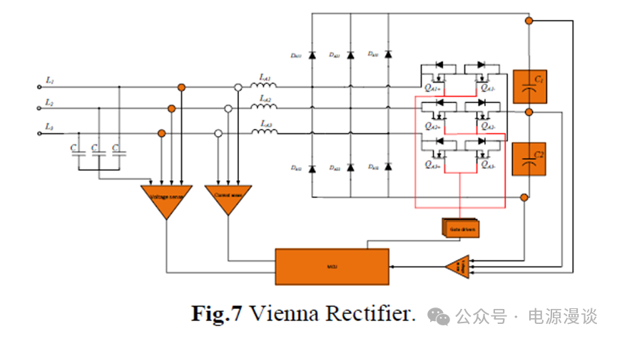 三相維也納PFC整流器,如圖7, 于1993 年在維也納技術(shù)大學(xué)開發(fā),用于避免在單向整流中發(fā)生低頻電源電流諧波,僅通過在進入三相二極管電橋的每個相橋臂上,插入可關(guān)斷功率半導(dǎo)體開關(guān)。