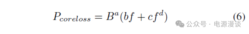 除了半導(dǎo)體功率器件之外,升壓電感的損耗也是重要的一部分損耗,它包括磁芯損耗和銅損,其中磁芯損耗曲線擬合公式如式(6)所示。對于 60u 高磁導(dǎo)率的磁芯,相關(guān)常數(shù)為a=2.284,b=3.050,c=0.0023,d=2.397。