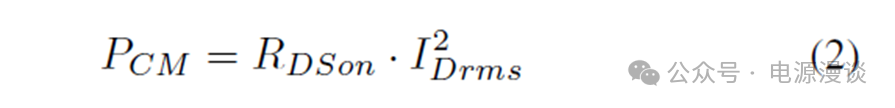 MOSFET導(dǎo)通損耗PCM表示為公式2所示,體現(xiàn)為純阻性損耗。