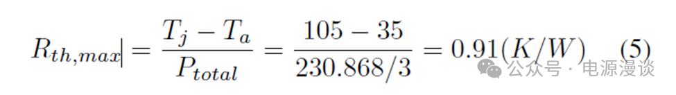 在本文中, 考慮一定的降額,工作結(jié)溫設(shè)定為 105℃,設(shè)計(jì)中使用了散熱器,每個(gè)相腿均使用一個(gè)獨(dú)立的散熱器,當(dāng)我們計(jì)算出各個(gè)器件的損耗后,基于此就可以進(jìn)行熱計(jì)算。從損耗計(jì)算來看,最大設(shè)計(jì)熱阻抗如下公式5所示。