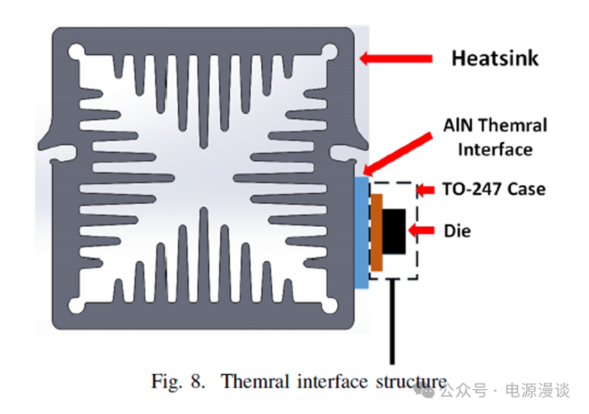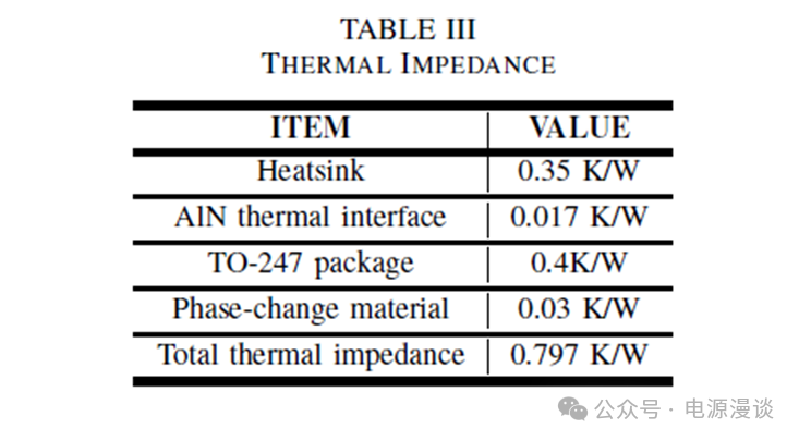 強(qiáng)制風(fēng)冷條件下散熱器的熱阻為0.35K/W, 來冷卻 SiC MOSFET 和 SiC 肖特基二極管。AlN 熱界面從器件到散熱器傳導(dǎo)熱量,并提供高壓絕緣,這兩點(diǎn)功能普遍存在于功率器件的散熱設(shè)計(jì)中。此外,還采用新型相變材料來代替導(dǎo)熱硅脂,因其較低的熱阻,可長期熱穩(wěn)定性高 ,熱容量大等優(yōu)勢,各個(gè)部分的熱阻列于如下表三中。