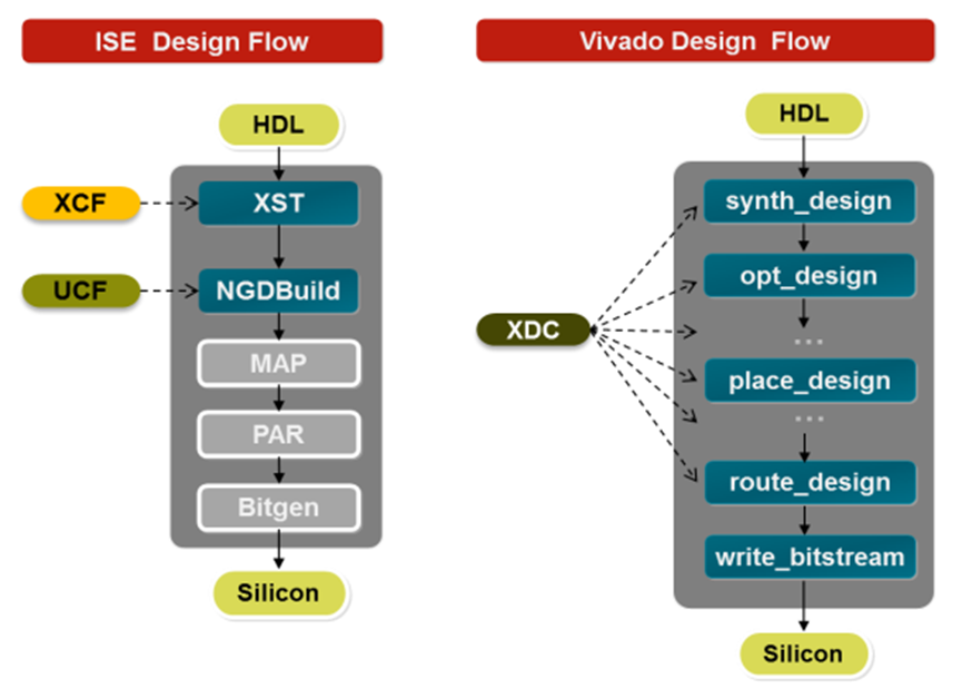 以下兩圖分別表示 ISE 和 Vivado 的基本設(shè)計(jì)流程: