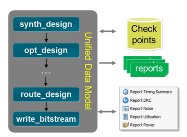 Vivado 中則統(tǒng)一了約束格式和數(shù)據(jù)模型,在設(shè)計(jì)實(shí)現(xiàn)的任何一個(gè)階段 都支持 XDC 約束,可以生成時(shí)序報(bào)告,在每一步都能輸出包含有網(wǎng)表、約束以及布局布線信息(如果有)的設(shè)計(jì)檢查點(diǎn)(DCP)文件,大大縮短了運(yùn)行時(shí)間。