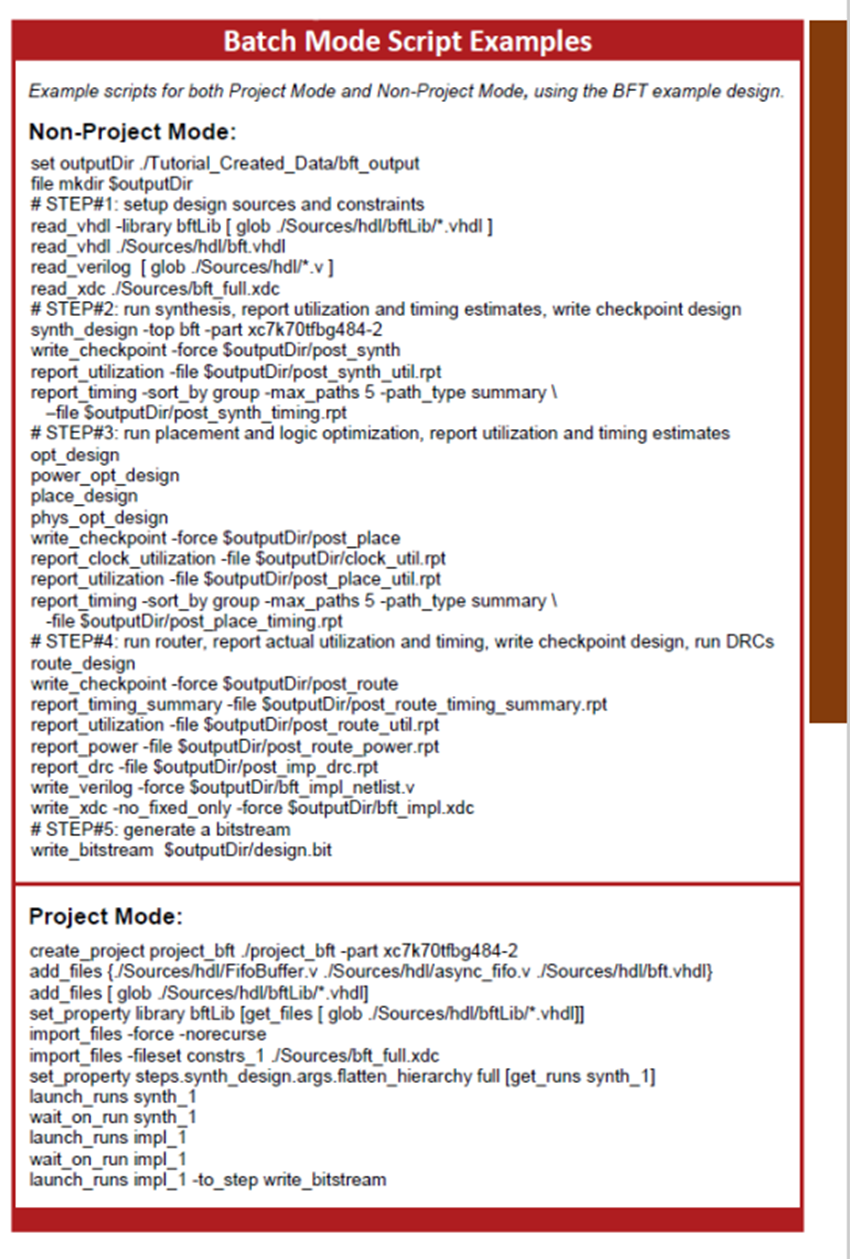 下圖所示是同一個(gè)設(shè)計(jì)(Vivado 自帶的 Example Design)采用兩種模式實(shí)現(xiàn)所需使用的不同腳本,更詳細(xì)的內(nèi)容可以在 UG975 和 UG835 中找到。需要注意的是,工程模式下的 Tcl 腳本更簡(jiǎn)潔,但并不是最底層的 Tcl 命令,實(shí)際執(zhí)行一條相當(dāng)于執(zhí)行非工程模式下的數(shù)條 Tcl 命令。
