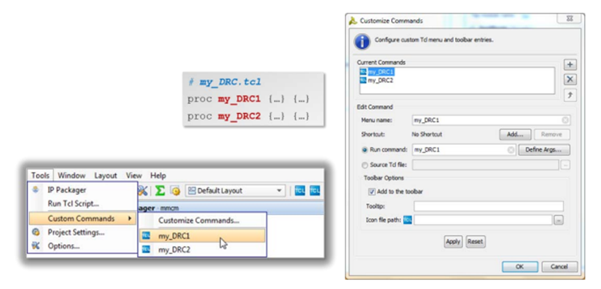 Vivado IDE 中還有一個(gè)擴(kuò)展功能,允許用戶把事先創(chuàng)建好的 Tcl 腳本以定制化命令的方式加入圖形化界面,成為一個(gè)按鈕,方便快速執(zhí)行。這個(gè)功能常常用來(lái)報(bào)告特定的時(shí)序信息、修改網(wǎng)表內(nèi)容、實(shí)現(xiàn) ECO 等等。