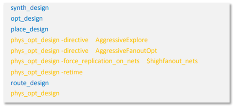 比如,我們可以寫這樣一個(gè) Tcl 腳本,在布局后,使用不同的 directive 或選項(xiàng)來(lái)跑多次物理優(yōu)化,甚至可 以再多運(yùn)行一次物理優(yōu)化,專門針對(duì)那些事先通過(guò) get_nets 命令找到并定義為 highfanout_nets 的高扇出網(wǎng)絡(luò)具體 directive 的含義可以通過(guò) UG835、UG904 或 phys_opt_design -help 命令查詢。