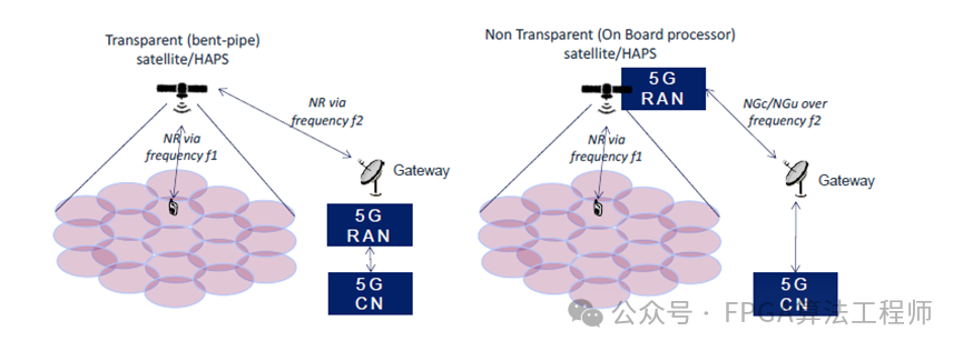 當然目前最熱門的技術(shù)討論是手機直連衛(wèi)星方案,最主要的兩種部署場景如下圖所示。