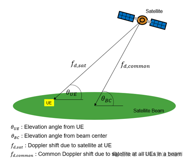 我們假設(shè)用戶設(shè)備(UE)位于衛(wèi)星波束中心。要對波束中心以外的衛(wèi)星波束中的UE進行建模(如下圖所示),并對波束中的所有UE應(yīng)用共同的多普勒頻移,可以使用預(yù)補償技術(shù)。在MATLAB中,可以啟用DopplerPreCompensator進行補償,而啟用RxDopplerCompensator則補償由于UE運動引起的殘留衛(wèi)星多普勒頻移(-)。