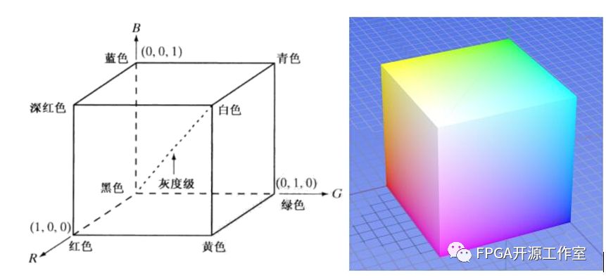 圖1左 RGB彩色立方體示意圖。圖1右,RGB 24bit彩色立方體。原點到白色頂點的中軸線是灰度線,r、g、b三分量相等,強度可以由三分量的向量表示。