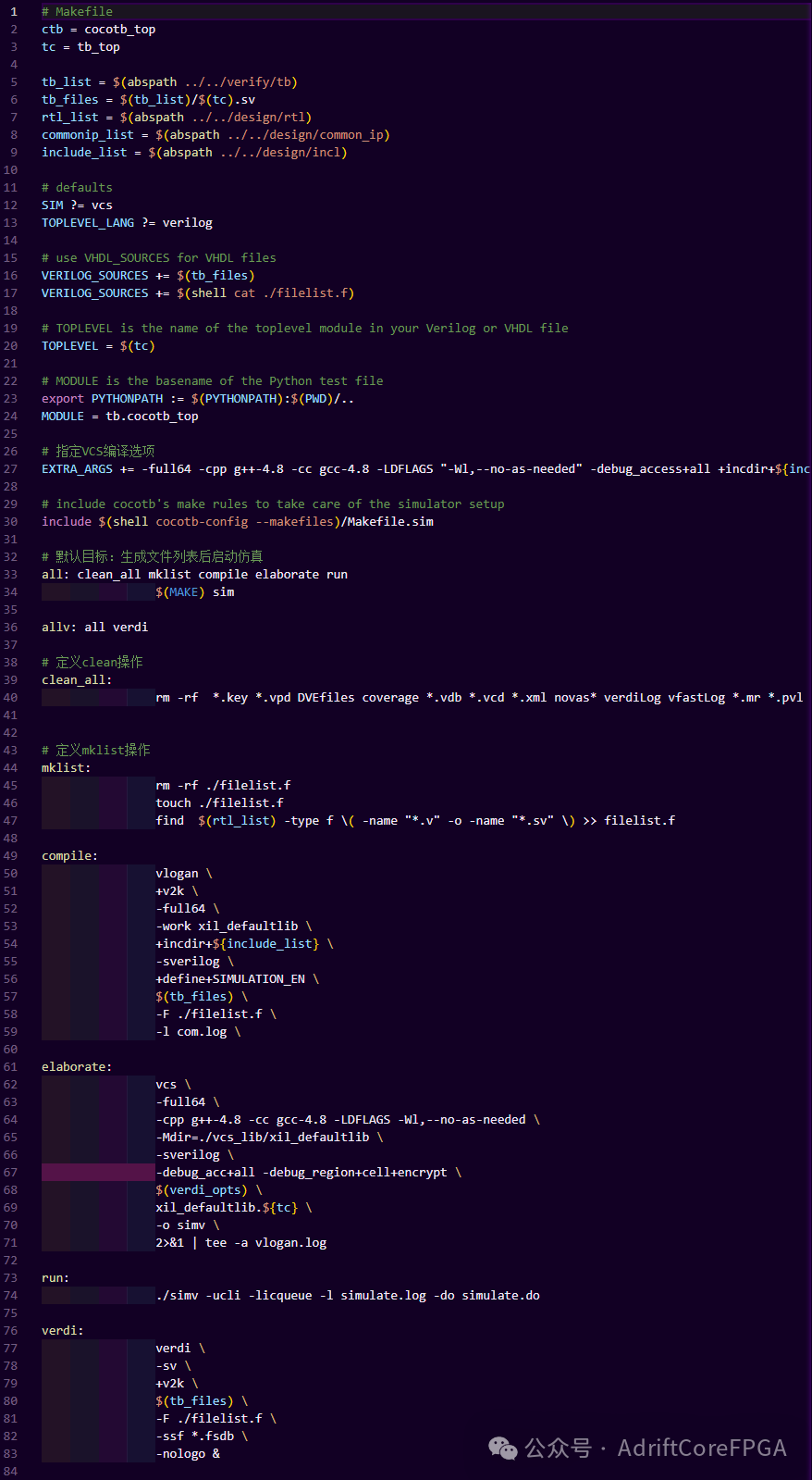 為構(gòu)建高度集成的自動(dòng)化驗(yàn)證環(huán)境,我在Cocotb原生Makefile基礎(chǔ)上深度定制,打通了Cocotb仿真控制→VCS編譯仿真(包括Vivado IP)→Verdi波形調(diào)試的端到端流水線。通過(guò)統(tǒng)一的任務(wù)入口(make all/make all),開(kāi)發(fā)者可一鍵完成從RTL編譯、測(cè)試用例執(zhí)行到覆蓋率報(bào)告生成的完整流程。下方開(kāi)源的Makefile模板已封裝多工具協(xié)同的核心配置,若采用類似仿真架構(gòu),可直接克隆適配至實(shí)際項(xiàng)目。