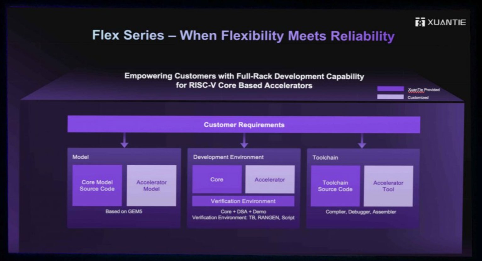 在AI算力突破的同時,指令集的定制化能力成為決定競爭力的關(guān)鍵變量。尤其是芯片設(shè)計客戶,將“定制”看作是差異化競爭力的核心所在。針對這些客戶需求,近期在北美RISC-V峰會,玄鐵重磅發(fā)布的FlexC系列,是玄鐵技術(shù)路線的創(chuàng)新突破。李玨表示Flex C系列的產(chǎn)品理念——不是提供現(xiàn)成指令,而是賦予客戶自主定制能力。他解釋道,傳統(tǒng)IP授權(quán)模式下,客戶定制指令后,其核心算法Know-how會向IP廠商開放,導(dǎo)致競對可直接復(fù)用。FlexC通過提供完整的指令集建模環(huán)境、硬件驗證平臺和性能分析工具,使客戶能在保護(hù)算法機(jī)密的前提下實現(xiàn)指令擴(kuò)展,打造最符合自身需求、最符合垂直場景需求、最能夠體現(xiàn)差異競爭力的RISC-V處理器產(chǎn)品。