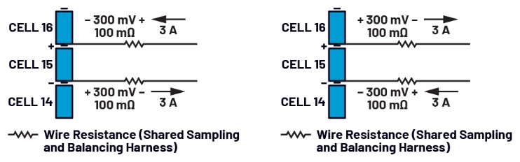 圖10.主動均衡運(yùn)行期間,均衡電流對電芯電壓測量的影響:左側(cè)為電芯充電,右側(cè)為電芯放電。